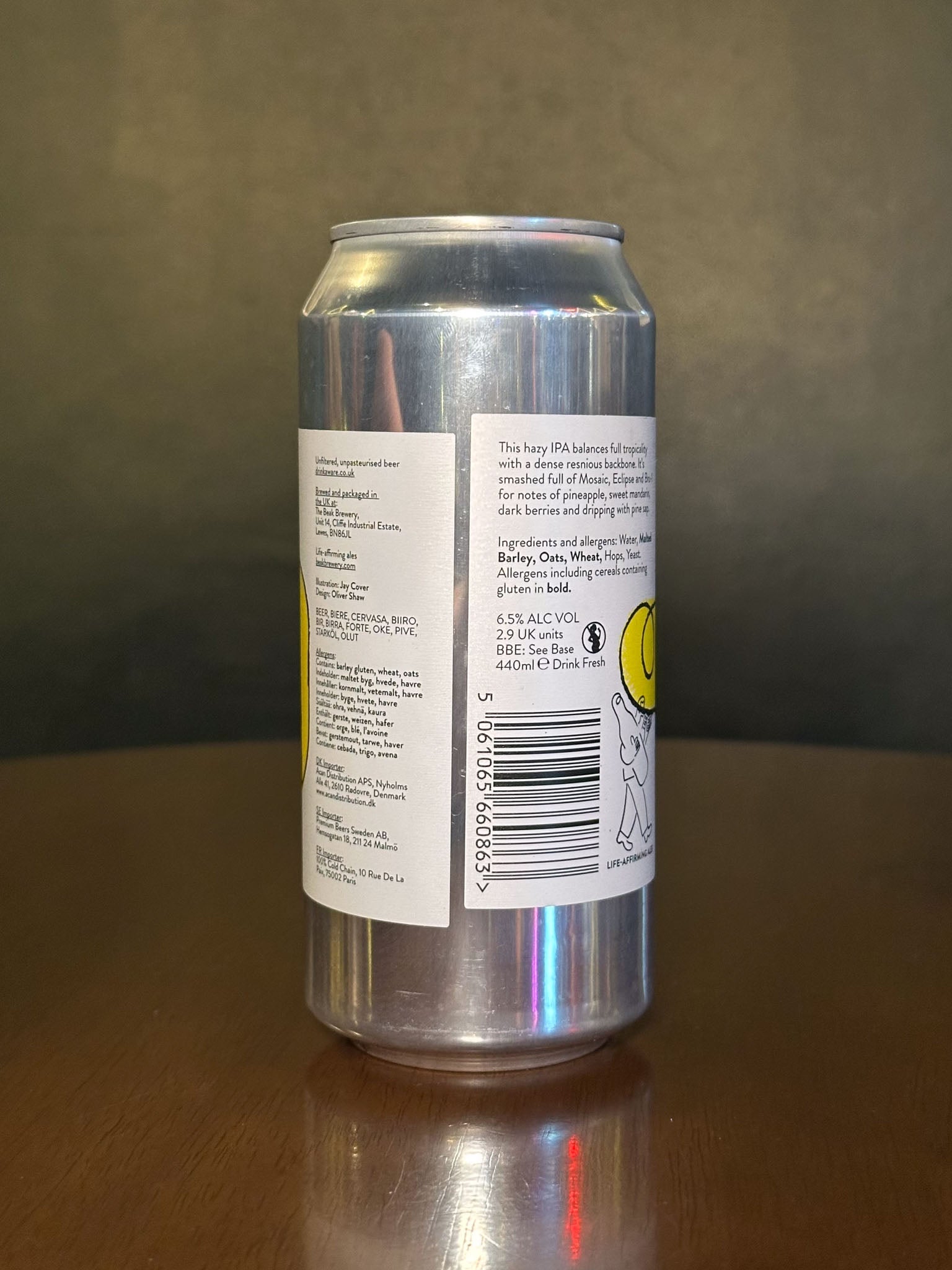 This hazy IPA balances full tropicality with a dense resnious backbone. It's smashed full of Mosaic, Eclipse and Bru-1 for notes of pineapple, sweet mandarin, dark berries and dripping with pine sap.